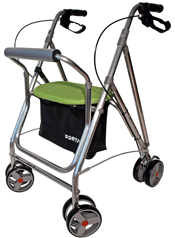 ANDADOR CON RUEDAS DELANTERAS GIRATORIAS Y TRASERAS, CON FRENOS Y ASIENTO