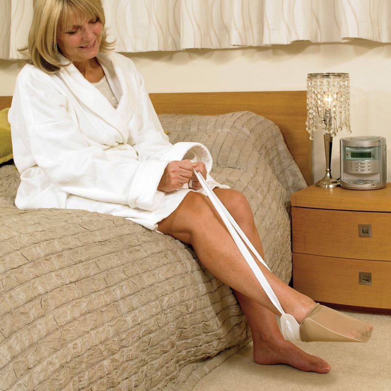 Ligera, económica y flexible ayuda para colocarse las medias o los calcetines.