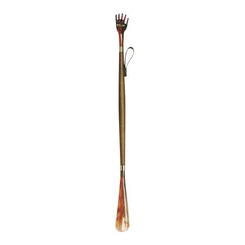 Este calzador está fabricado en madera de haya. El puño tiene forma de mano y funciona como rascador, tanto el puño como la pala están fabricados en acetato de celulosa y tiene anillas de latón en las uniones. Sus características principales son las siguientes: