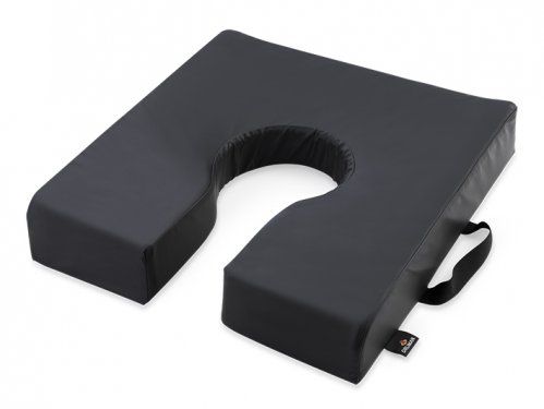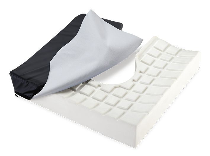Espuma viscoelástica de alta densidad con gran capacidad de recuperación de forma y especialmente conformado para adoptar una correcta postura y conseguir una adecuada estabilidad pélvica. Posee un ligero declive en la zona de los muslos y una pequeña elevación central que proporciona un efecto abductor natural, evitando el contacto entre ellos e impide que se deslice del cuerpo hacia delante.