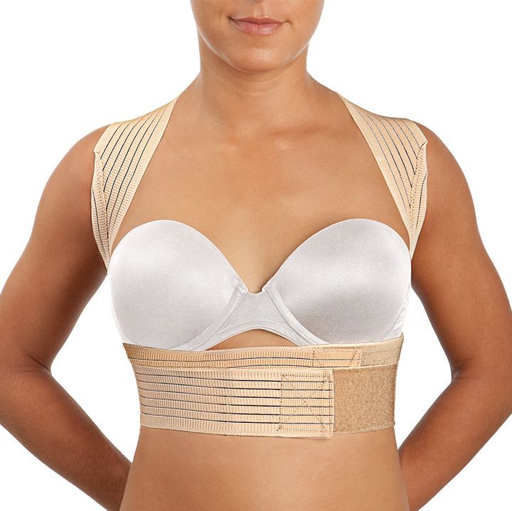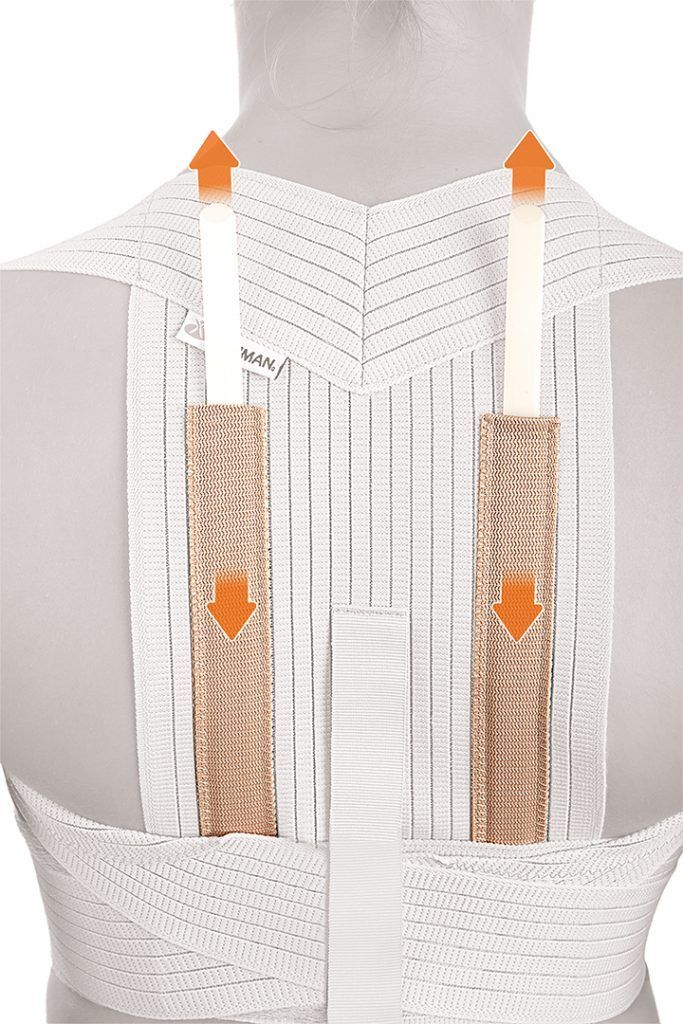 Banda ancha dorsal de tejido elástico multibanda transpirable reforzada con dos ballenas semirrígidas  paravertebrales. Dos bandas elásticas superiores que se prolongan sobre los hombros pasan por debajo de las axilas, zona donde está reforzada con doble capa de tejido para una mayor comodidad de uso. Dichas bandas cruzan por la espalda y cierran en el abdomen permitiendo ejercer una tracción gradual y personalizada de la espalda mediante la retropulsión de los hombros hasta reducir la perjudicial postura cifótica.