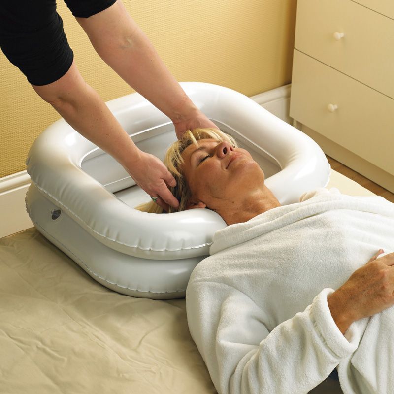 De resistente plástico vinilo, con dos aros hinchables y una abertura para el cuello. Es muy práctico para lavar a una persona encamada. Se puede inflar fácilmente sin necesidad de bomba. Incorpora un tubo de drenaje para evacuar el agua.