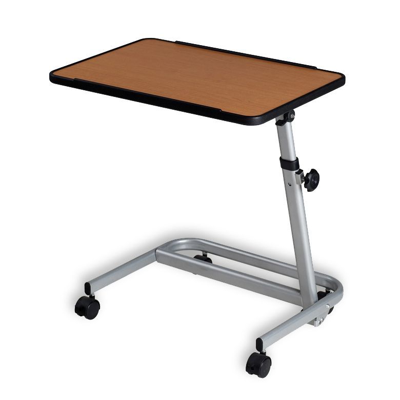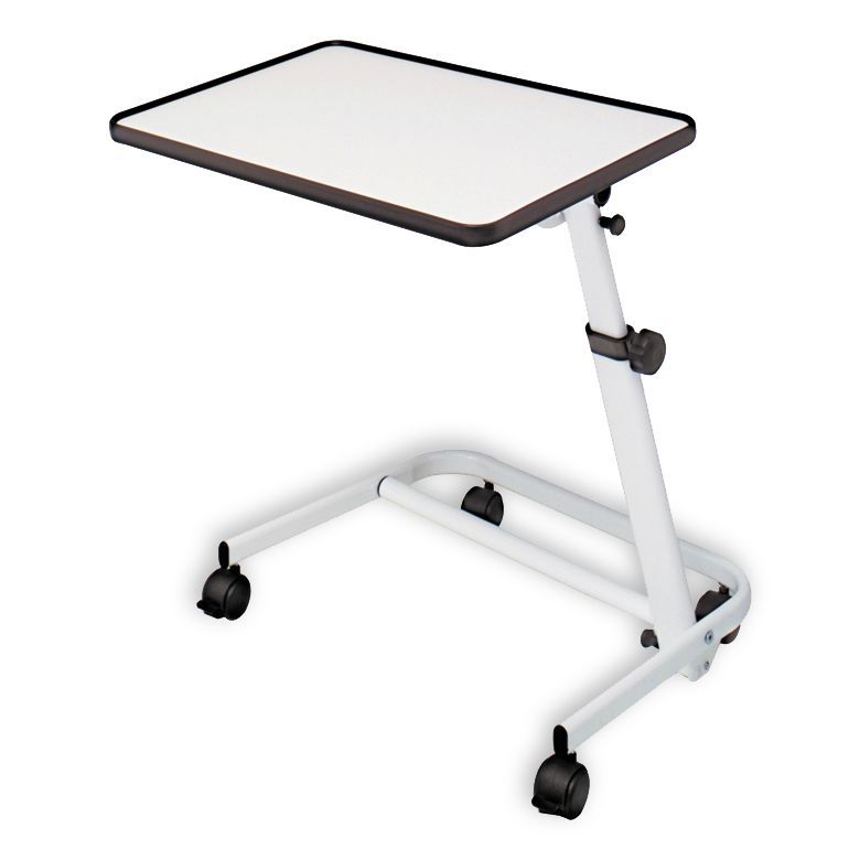 Elegante mesita graduable en altura y plegable. El tablero bascula hasta 90º en ambos sentidos y la mesa se pliega quedando plana para guardarla o transportarla. Además el mástil bascula hasta 80º para acercarlo mas al usuario si es preciso. Suministrada con cuatro ruedas, dos de ellas con freno. Altura graduable: desde 61 a 94 cm. Tablero de 60 x 40 cm. Peso total 9 Kg.