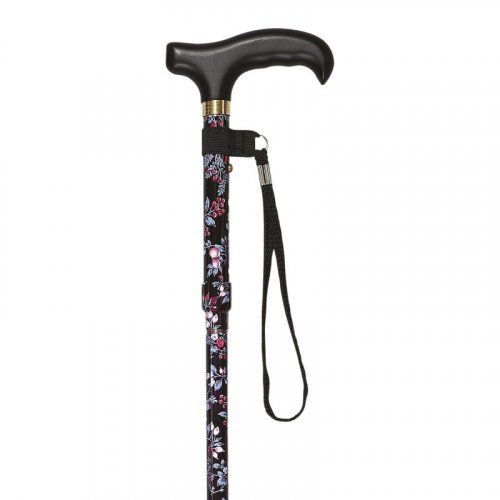 Muletilla mini plegable en aluminio, estampada con flores y fondo negro