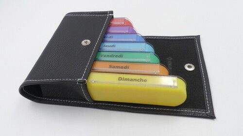 Nuestro pastillero semanal Evolution tiene una bolsa cosida de alta calidad, cerrada con una presión muy práctica para el uso diario. Está compuesto por 7 grandes compartimentos de diferentes colores e identificados por el nombre del día, separados en 4 espacios para diferenciar las comidas del día.