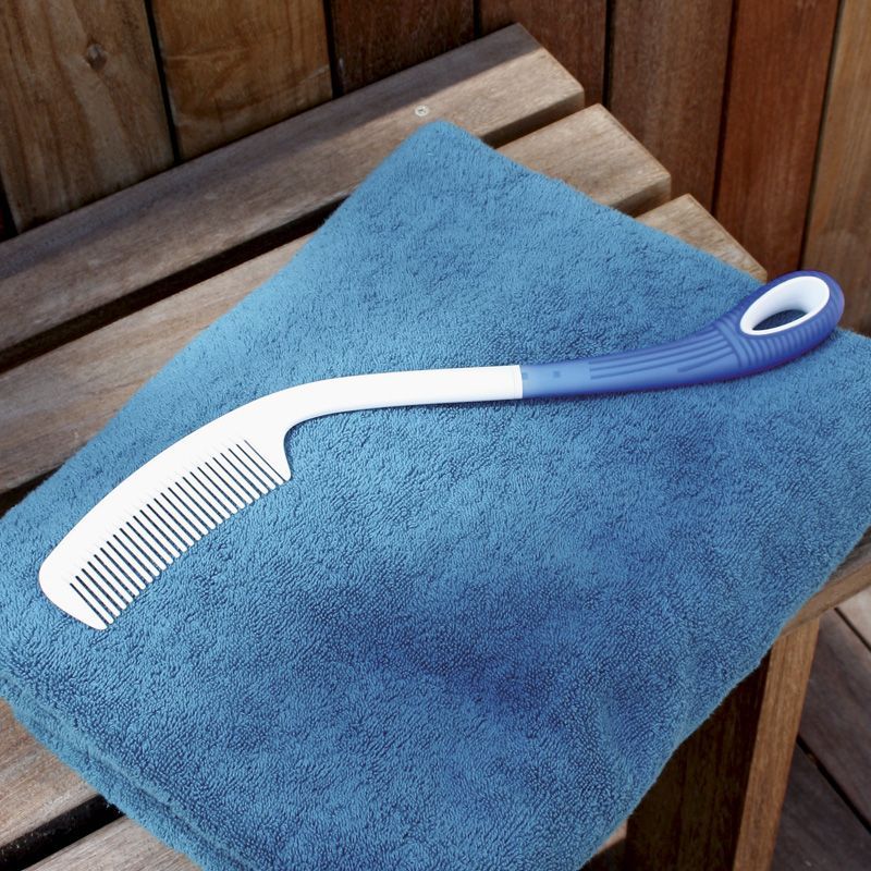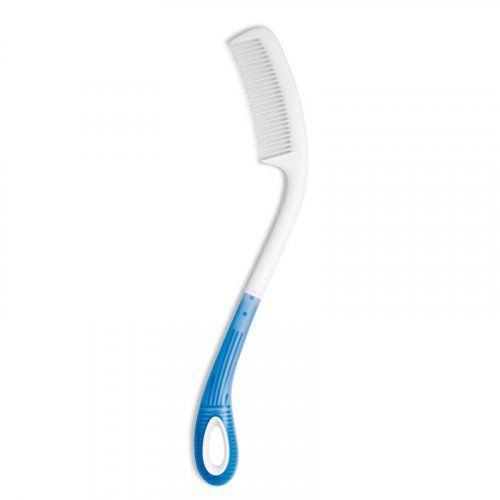Peine de mango largo, ergonómico y curvado para adaptarse a la forma de la cabeza, lo que facilita peinarse con un mínimo esfuerzo aguantándolo cerca del cuerpo.
