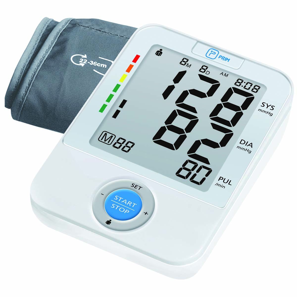 Medición precisa de la tensión arterial en el brazo con fecha, hora y pulso.